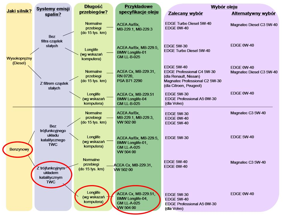 Poniżej przedstawiamy przykładową tabelę doboru olejów silnikowych firmy Castrol po specyfikacjach producentów (źródło danych www.castrol.pl , http://intercars.pl/s/poradnik-jak-dobrac-olej-silnikowy)